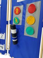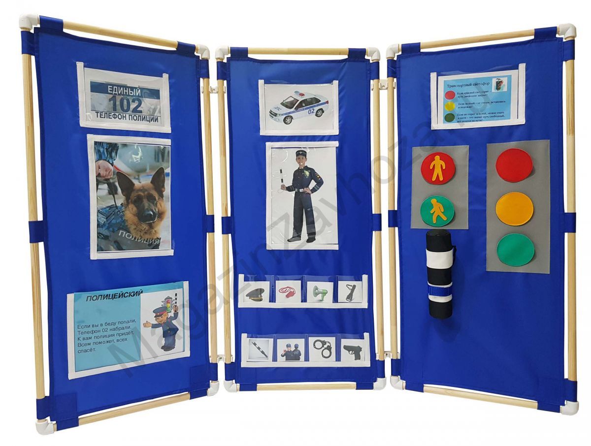 Ширма разделена на секции. На каждой секции имеются прозрачные полиэтиленовые карманы для размещения печатных пособий формата А4 или А5. Пластиковые учебно-наглядные пособия для сюжетно-ролевых игр в комплекте. Печатные пособия в комплект не входят. Материал изготовления: каркас - дерево, накидка - оксфорд.