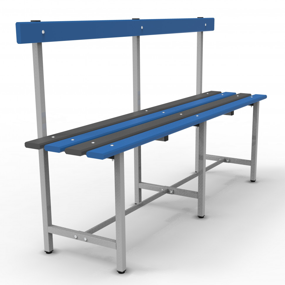 Скамья изготовлена на металлическом каркасе из трубы квадратного сечения 25х25, покрытым порошковой полимерной краской серого цвета. Сиденье изготовлено из пластикового настила, толщиной 20мм. Скамья предназначена для установки в раздевалках, спортивных школах и дошкольных учреждениях. Поставляется в разобранном виде в картонной упаковке