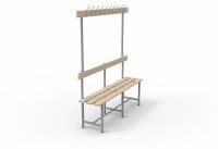 Скамья изготовлена на металлическом каркасе из трубы квадратного сечения 25х25, покрытым порошковой полимерной краской серого цвета. Сиденье доска шлифованная, покрыта лакосодержащим составом. Изделие предназначено для установки в раздевалках, спортивных школах и дошкольных учреждениях. Поставляется в разобранном виде, в компактной картонной таре.
