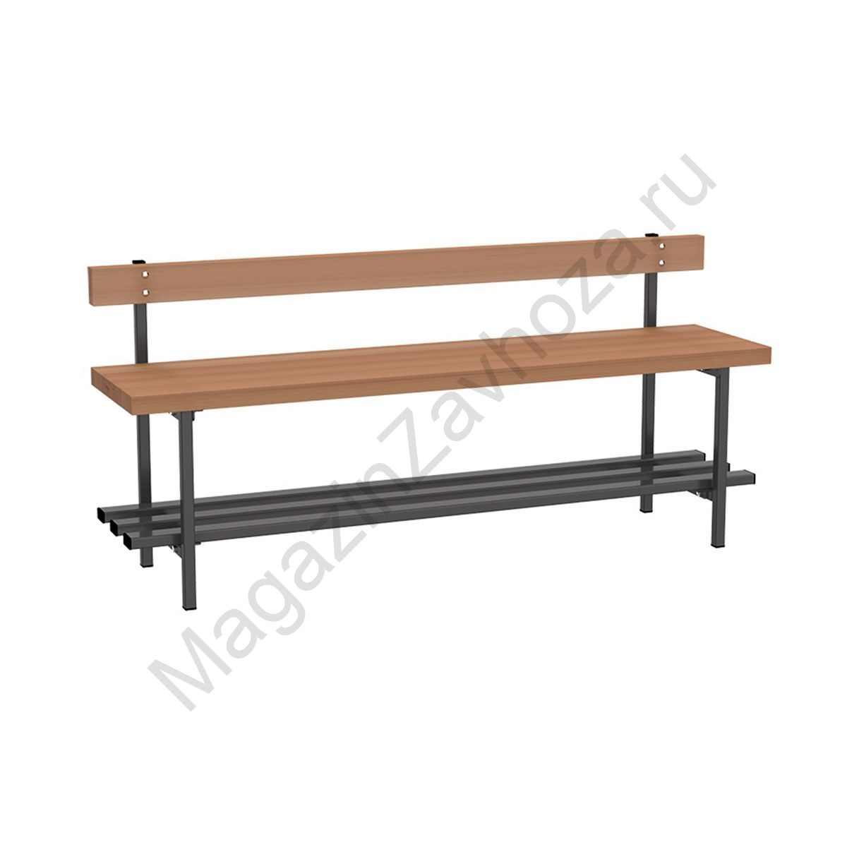 Скамья для раздевалок со спинкой. Изготовлена из цельного массива дерева и сварной металлоконструкции. Размеры: высота - 700 мм; ширина посадочного места - 350 мм; длина - 2000 мм. Вес: 21 кг.