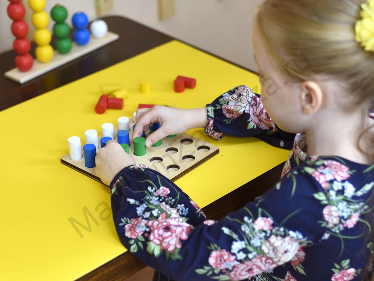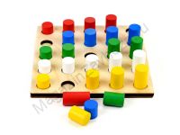 Основа фанера 10 мм с отверстиями. Размер основы: 18,5 х 18,5 см. Набор колышков пяти цветов и пяти высот (красный, жёлтый, зелёный, синий, белый). Общее количество 25 штук.