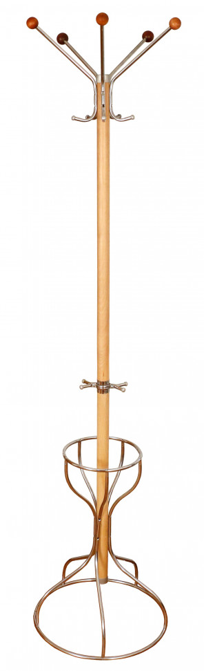 Вешалка для одежды напольная на 5 крючков. Выполнена из натурального дерева. Поставляется в разобранном виде в картонной таре. Крючки и основание вешалки напольной выполнены из серого металлика. Шары деревянные