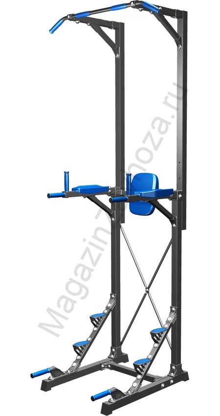 Максимальная нагрузка (человек + утяжелители) 170 кг. Расстояние на брусьях от спинки до вертикальных рукоятей 44 см. Укомплектованы вымпелами с изображениями упражнений и групп мышц. Регулировка высоты на 238, 249, 260 см. Стойку Pro можно модифицировать в двустороннюю. Это позволит вешать боксерский мешок. Гарантия 3 года.