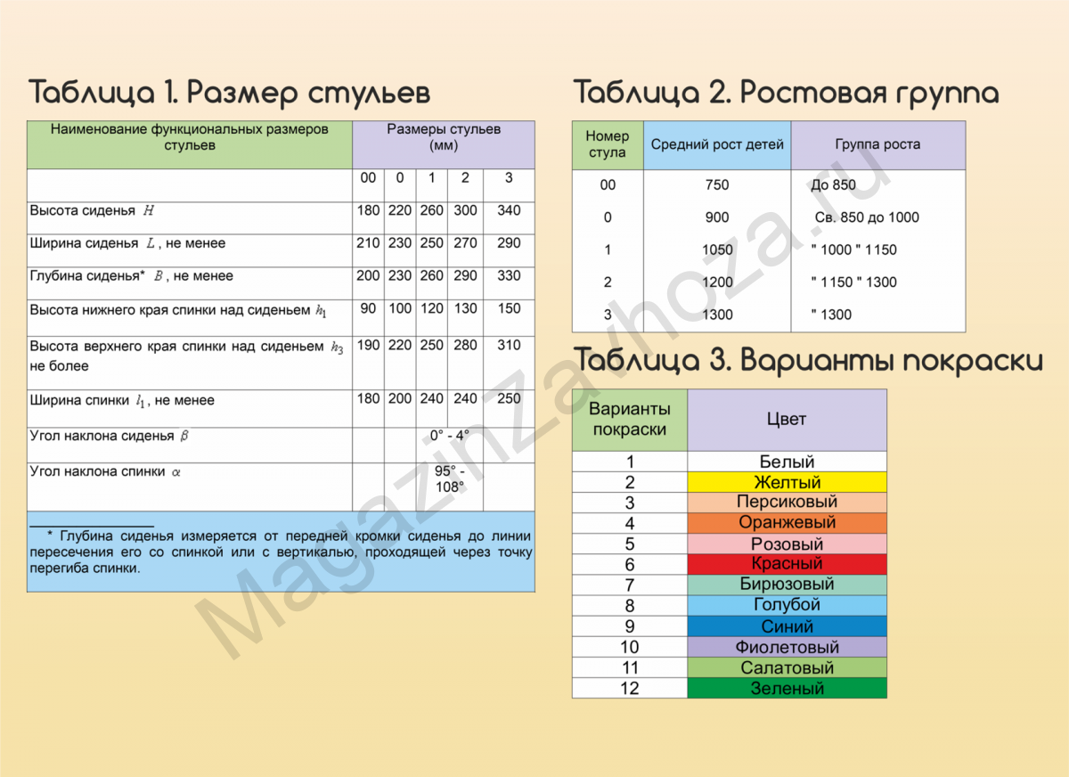 По ГОСТу детская мебель делится на несколько номеров, каждый из которых соответствует среднему росту детей определенного возраста.