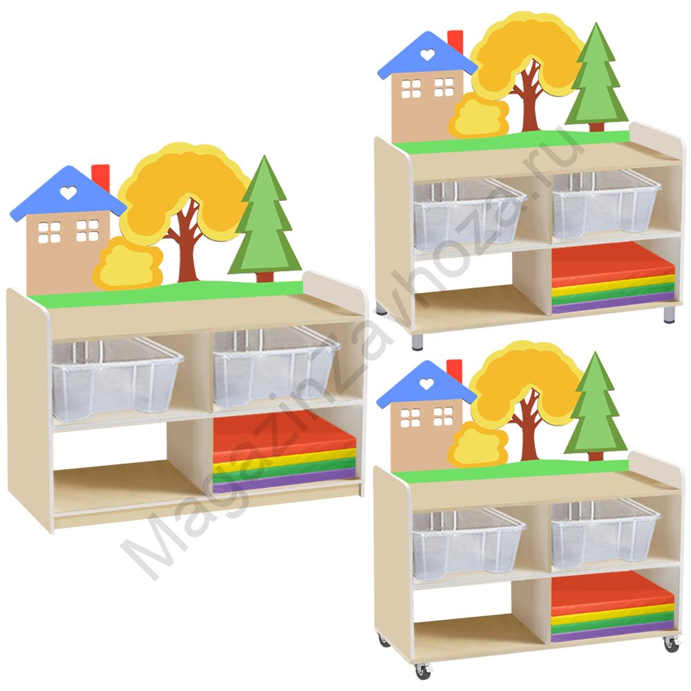 ЛДСП бук или цветное. Кромка ПВХ. Декор МДФ, краска "Тиккурила" Размеры:890х450х1000мм Вес:31кг Объём:0,12м/куб Контейнер ПВХ :395х295х140мм - 2шт. Мини-маты 400х400х20мм - 4шт. На цоколе. На металлических ножках. На колёсах.