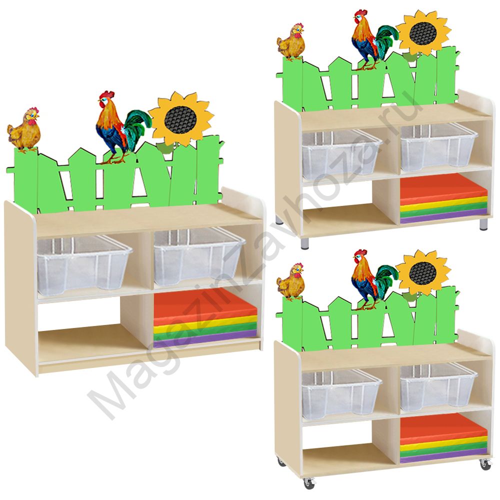 ЛДСП бук или цветное. Кромка ПВХ. Декор МДФ, краска "Тиккурила" Размеры:890х450х1000мм Вес:31кг Объём:0,12м/куб Контейнер ПВХ :395х295х140мм - 2шт. Мини-маты 400х400х20мм - 4шт. На цоколе. На металлических ножках. На колёсах.