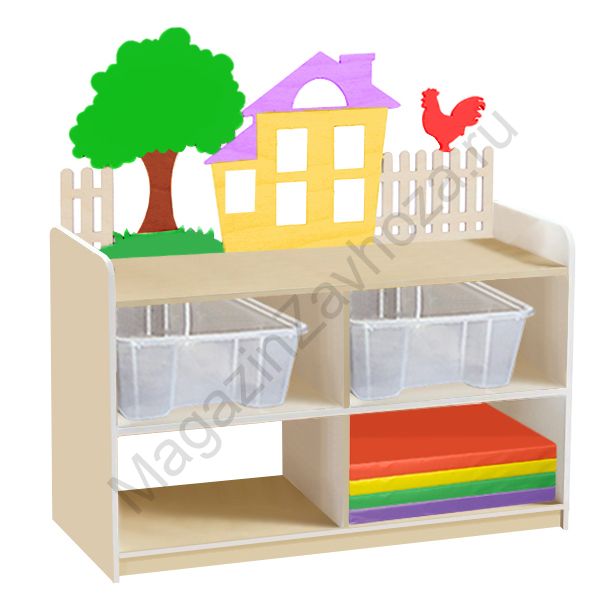 ЛДСП бук или цветное, декорация из фанеры, лак или краска. Размеры:890х450х1000мм Вес:31кг Объём:0,12м/куб Контейнер ПВХ:300х420х100мм - 2шт. Направляющий полозок алюминий. Мини-маты 400х400х20мм - 4шт.