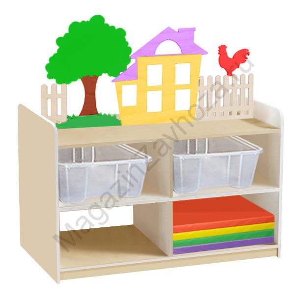 ЛДСП бук или цветное, декорация из фанеры, лак или краска. Размеры:890х600х1000мм Вес:42кг Объём:0,13м/куб Контейнер ПВХ:420х300х100мм - 4шт. Направляющий полозок алюминий. Мини-маты 400х400х20мм - 4шт.