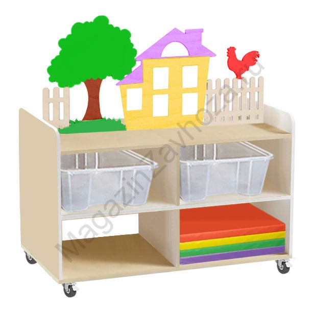 ЛДСП бук или цветное, декорация из фанеры, лак или краска. Размеры:890х600х1000мм Вес:42кг Объём:0,13м/куб Контейнер ПВХ:420х300х100мм - 4шт. Направляющий полозок алюминий. Мини-маты 400х400х20мм - 4шт. Установлены пластиковые или усиленные поворотные прорезиненные колеса. 2 из них со стопором (тормозом).
