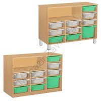 Из ЛДСП Бук или Цветного на цоколе р-ры: 976х450х800мм На метел.ножках р-ры: 976х450х840мм Вес:40кг Объём:0,14м/куб Контейнер ПВХ:300х420х100мм - 9шт. Контейнер ПВХ:300х420х230мм - 1шт. Крепёж к стене обязателен. Направляющий полозок алюминий.