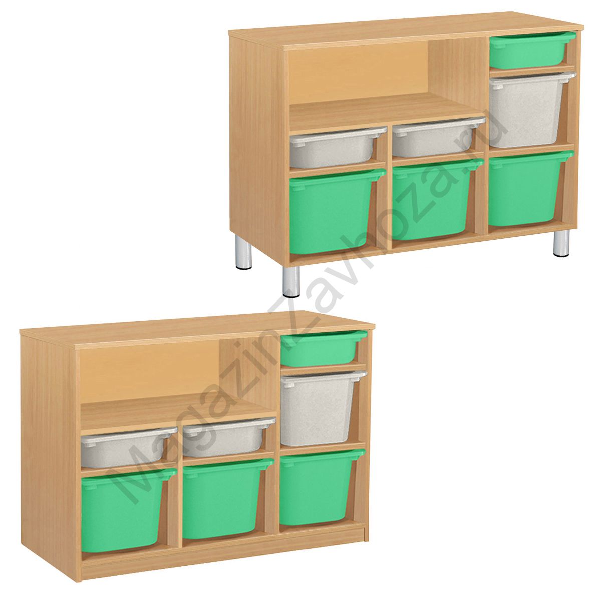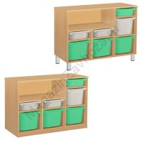 Из ЛДСП Бук или Цветного на цоколе р-ры: 976х450х800мм На метел.ножках р-ры: 976х450х840мм Вес:40кг Объём:0,14м/куб Контейнер ПВХ:300х420х100мм - 3шт. Контейнер ПВХ:300х420х230мм - 4шт. Крепёж к стене обязателен. Направляющий полозок алюминий.