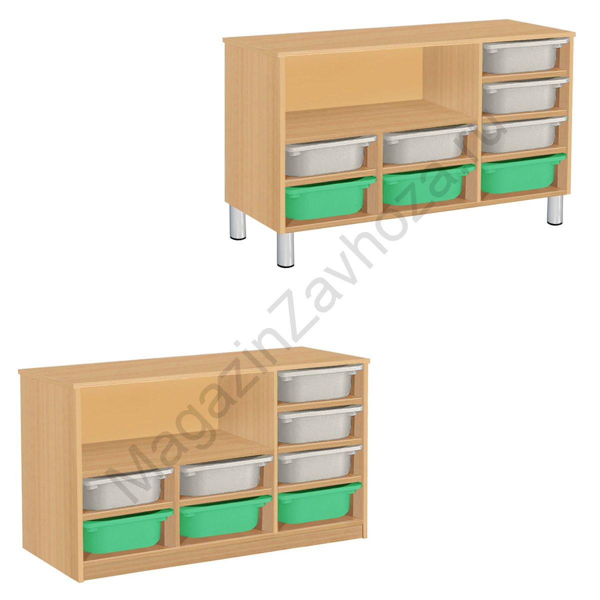 Из ЛДСП Бук или Цветного на цоколе р-ры: 976х450х650мм На метел.ножках р-ры: 976х450х690мм Вес:27кг Объём:0,06м/куб Контейнер ПВХ:300х420х100мм - 8шт. Направляющий полозок алюминий.