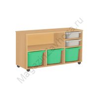 Из ЛДСП Бук или Цветного Кромка ПВХ. Размеры:976х450х650мм Вес:27кг Объём:0,06м/куб Контейнер ПВХ:300х420х100мм - 2шт. Контейнер ПВХ:300х420х230мм - 3шт. Установлены пластиковые или усиленные поворотные прорезиненные колеса. 2 из них со стопором (тормозом). Направляющий полозок алюминий.