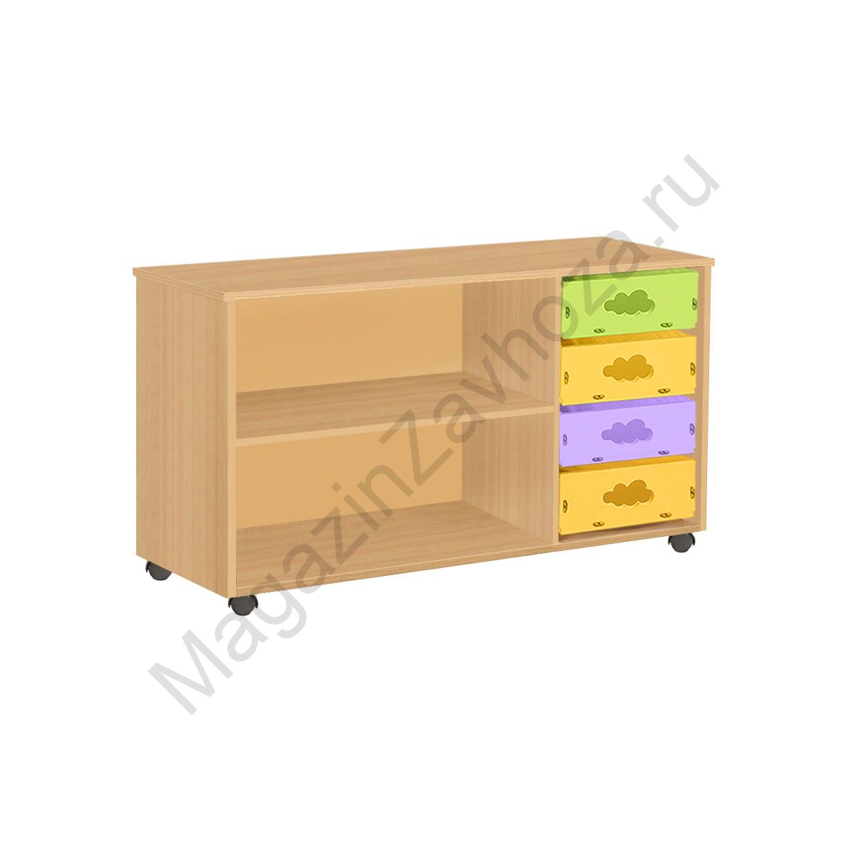 Из ЛДСП Бук или Цветного Кромка ПВХ. Размеры:976х450х650мм Вес:24кг Объём:0,026м/куб Контейнер МДФ:300х420х100мм - 4шт. цвета - ЛАЙМ, ГОЛУБОЙ, ОРАНЖЕВЫЙ, РОЗОВЫЙ, ЖЕЛТЫЙ, ИРИС. Установлены пластиковые или усиленные поворотные прорезиненные колеса. 2 из них со стопором (тормозом). Направляющий полозок алюминий.