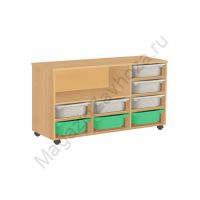 Из ЛДСП Бук или Цветного Кромка ПВХ. Размеры:976х450х650мм Вес:27кг Объём:0,06м/куб Контейнер ПВХ:300х420х100мм - 8шт. Установлены пластиковые или усиленные поворотные прорезиненные колеса. 2 из них со стопором (тормозом). Направляющий полозок алюминий.
