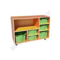 Из ЛДСП Бук или Цветного Кромка ПВХ. Размеры:976х450х650мм Вес:27кг Объём:0,03м/куб Контейнер МДФ:300х420х100мм - 4шт. Контейнер МДФ:300х420х230мм - 2шт. цвета - ЛАЙМ, ГОЛУБОЙ, ОРАНЖЕВЫЙ, РОЗОВЫЙ, ЖЕЛТЫЙ, ИРИС. Установлены пластиковые или усиленные поворотные прорезиненные колеса. 2 из них со стопором (тормозом). Направляющий полозок алюминий.