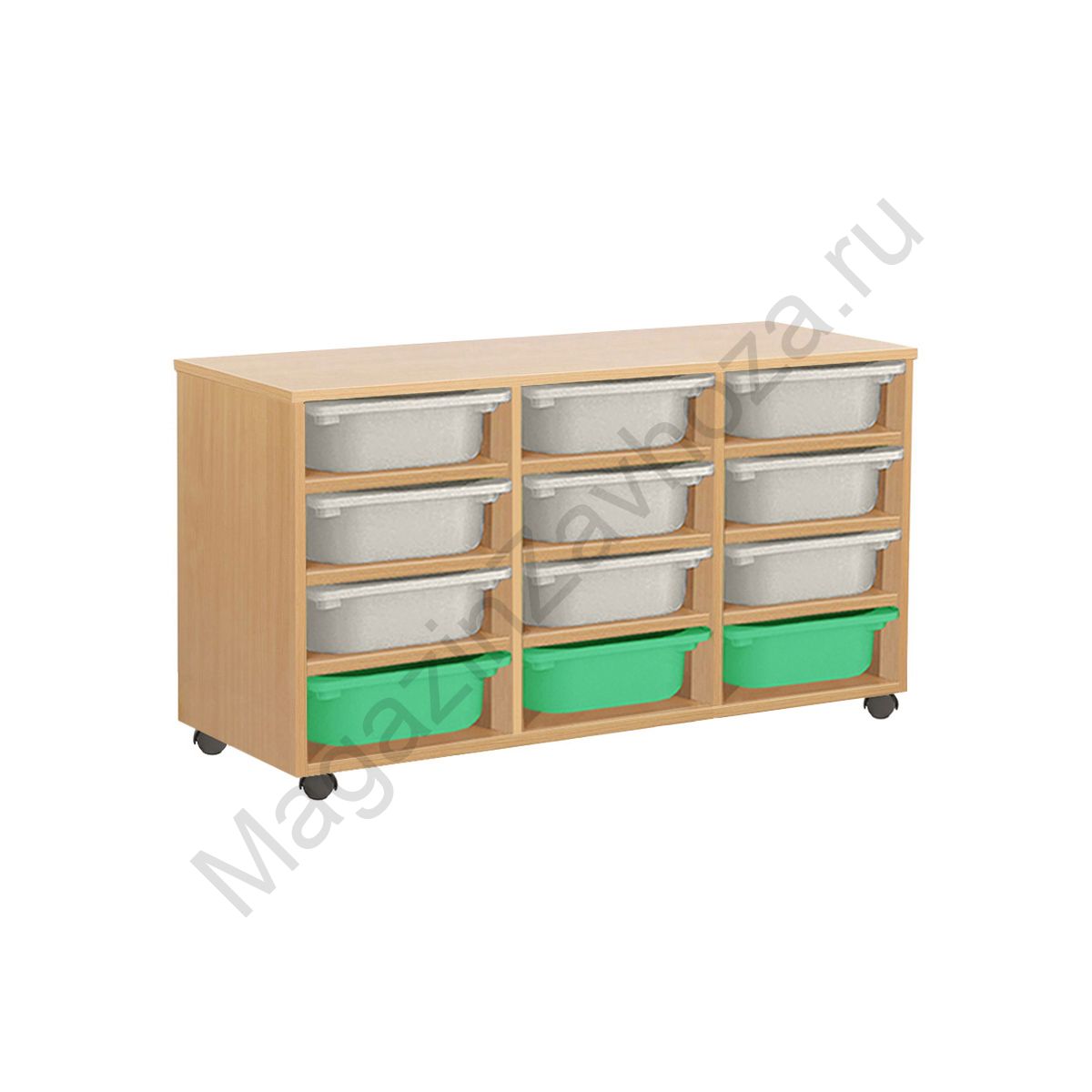 Из ЛДСП Бук или Цветного Кромка ПВХ. Размеры:976х450х650мм Вес:38кг Объём:0,1м/куб Контейнер ПВХ:300х420х100мм - 12шт. Установлены пластиковые или усиленные поворотные прорезиненные колеса. 2 из них со стопором (тормозом). Направляющий полозок алюминий.