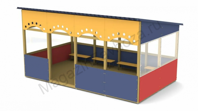 Артикул: ТН-28 Размер: 4000*3000*2400 mm Возможно изготовление по Вашим размерам с учетом нормативов ГОСТ. Используемые материалы: фанера березовая ФСФ (повышенной влагостойкости),клееный брус,труба металлическая Лакокрасочное покрытие: металл - полимерно-порошковое по каталогу RAL. Фанера - трехкомпонентная краска, повышенной стойкости к сложным погодным условиям, истиранию, воздействию ультрафиолета.
