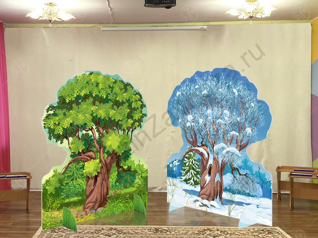 Театральная декорация "Дуб" (лето-зима) выполнена из МДФ, с нанесением полноцветного рисунка с двух сторон. Высота декорации 1,2м, ширина - 1м.