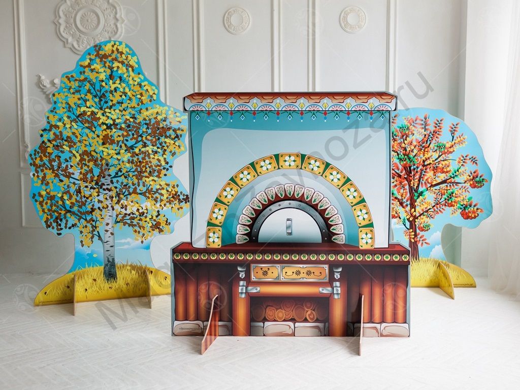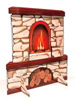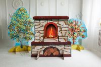 Театральная декорация "Камин/Русская печь" выполнена из МДФ, с нанесением полноцветного рисунка с двух сторон. Высота декорации 1,07м, ширина - 1,05м.