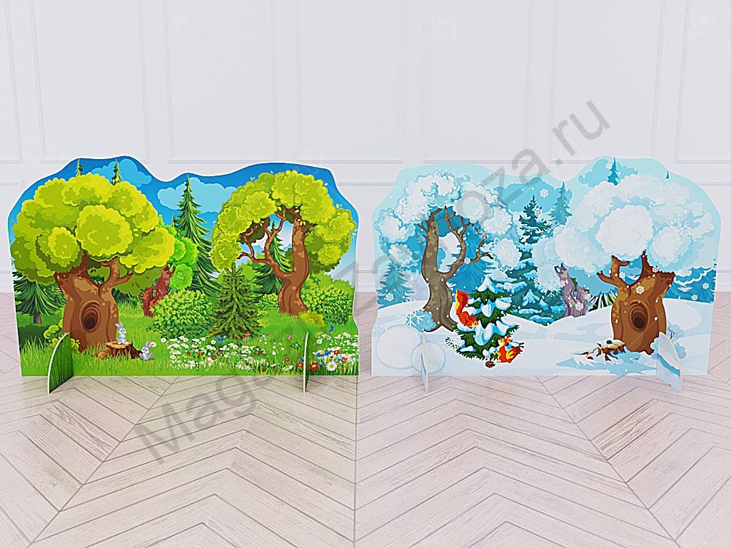 Театральная декорация "Лесная опушка" выполнена из МДФ, с нанесением полноцветного рисунка с двух сторон. Декорация имеет устойчивые подножки. Высота декорации 0,96м, ширина - 1,5м.