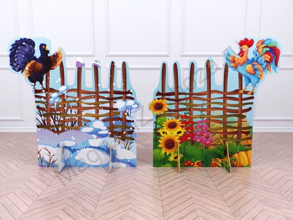 Театральная декорация "Плетень с петухом/глухарем" (лето-зима) выполнена из МДФ, с нанесением полноцветного рисунка с двух сторон. Высота декорации 1м, ширина - 1м. Декорация "Плетень" порадует детишек на любом празднике.  Выполненная по стандартам ФГОС ДО декорация прослужит Вам не один год.