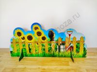 Театральная декорация "Забор с подсолнухами" выполнена из МДФ, с нанесением полноцветного рисунка с двух сторон. Высота декорации 0,55м, ширина - 1,2м. Декорация подойдет в качестве дополнения к любому дереву или теремку, представленному у нас на сайте.