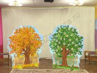 Театральная декорация "Яблоня садовая" (осень-весна) выполнена из МДФ, с нанесением полноцветного рисунка с двух сторон. Высота декорации 1,1м, ширина - 1м.