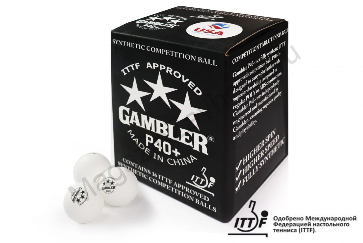 Gambler P40 + - полностью синтетические мячи для соревнований, одобренные междуародной федерацией по настольному теннису (ITTF). P40 + разработан для большей продолжительности вращения и обладает превосходной прочностью по сравнению с обычными конструкциями из полиэстера или АБС. Gambler P40 + были независимо разработаны и произведены компанией Gambler, что обеспечивает превосходное качество и игровые возможности. В мячах Gambler используется специальное соотношение смолы АБС, что делает их более твердыми и быстрыми, как популярные мячи из Японии.