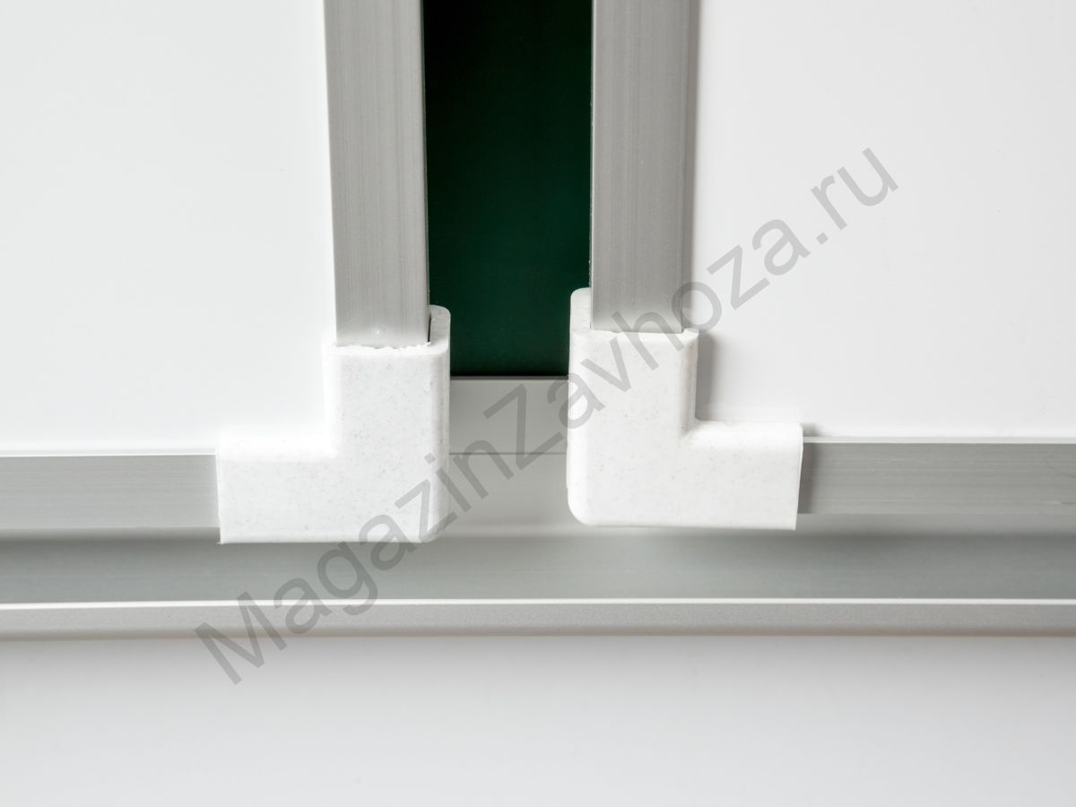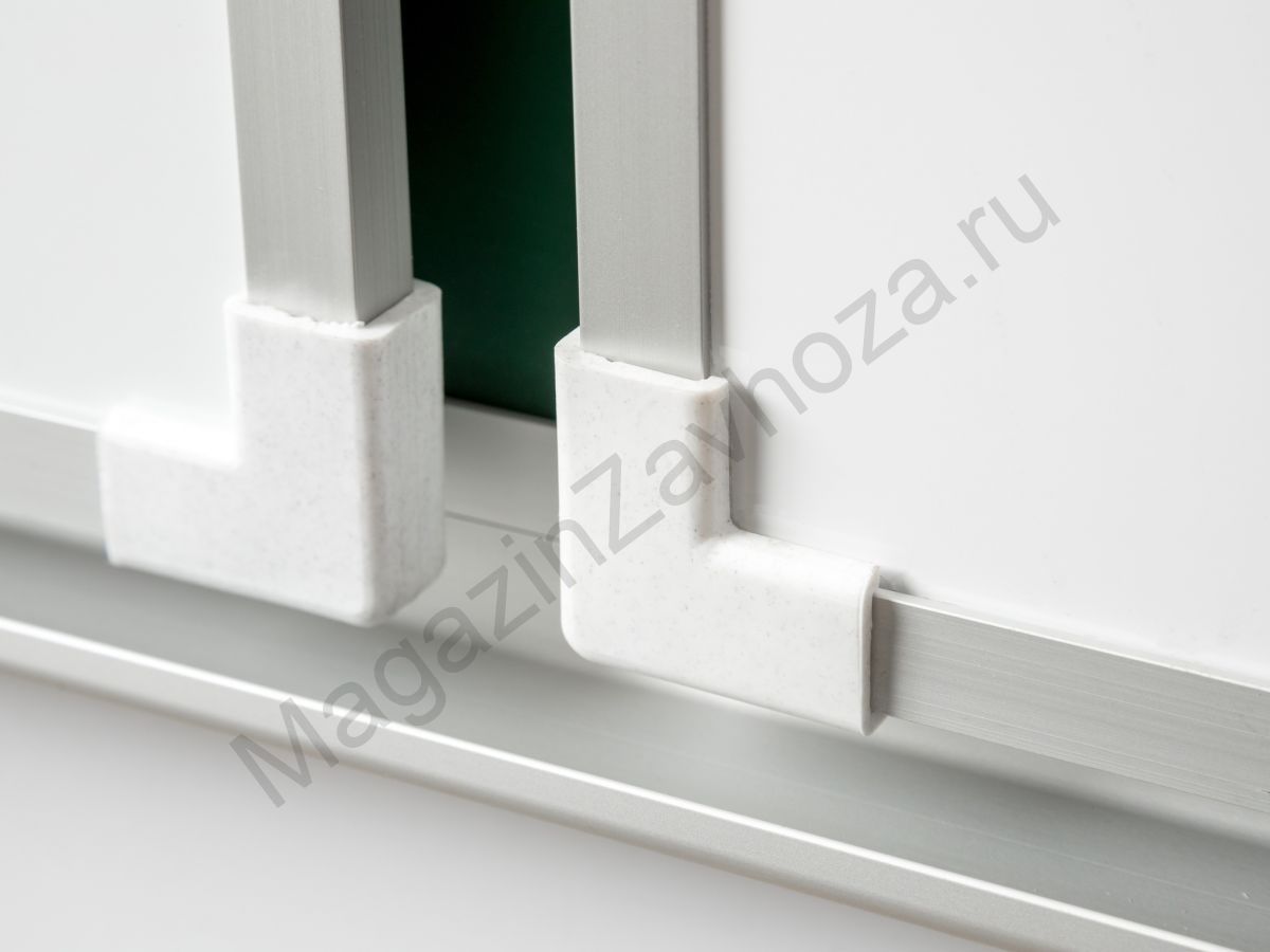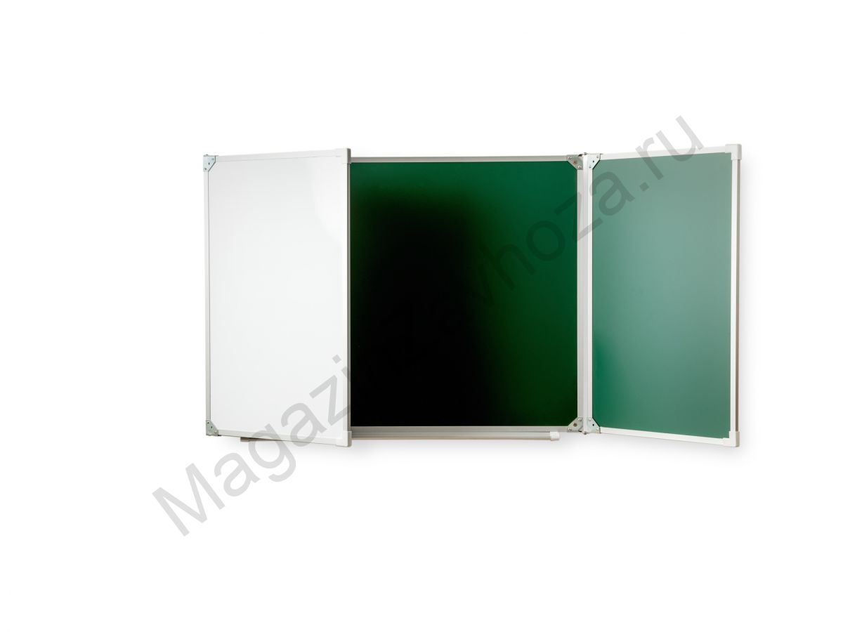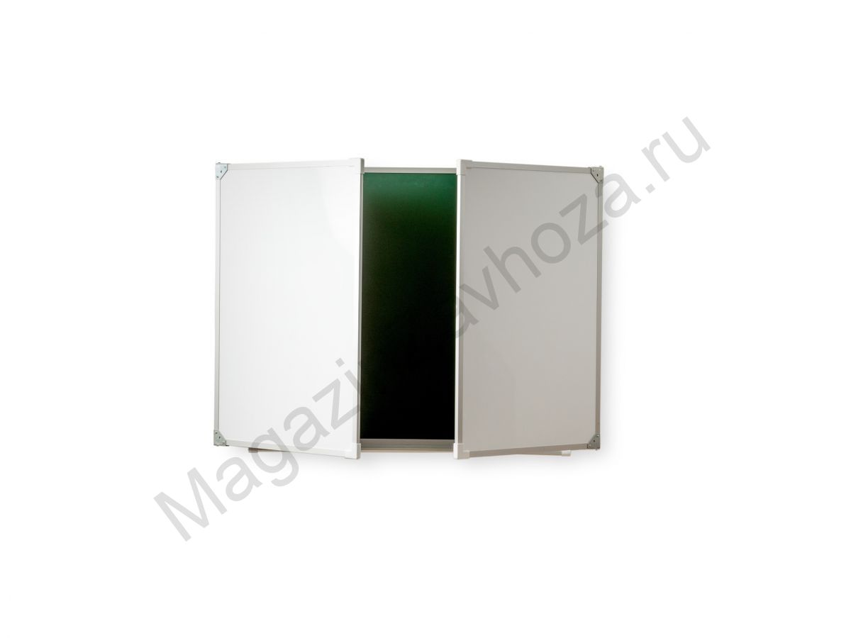 Рабочая поверхность изготовлена из полимерного листа высочайшего качества, обрамление — высокопрочный алюминиевый профиль, благодаря чему доска имеет высокую износоустойчивость, прочность и надежность конструкции. 1-й элемент это центральная часть школьной доски, которая крепится к стене, а створки (2-й и 3-й элементы), могут независимо открываться и закрываться от плоскости центральной части доски до плоскости стены. Петли многоэлементных досок рассчитаны на нагрузку свыше 100 кг. Имеется лоток для мела/маркера и принадлежностей.