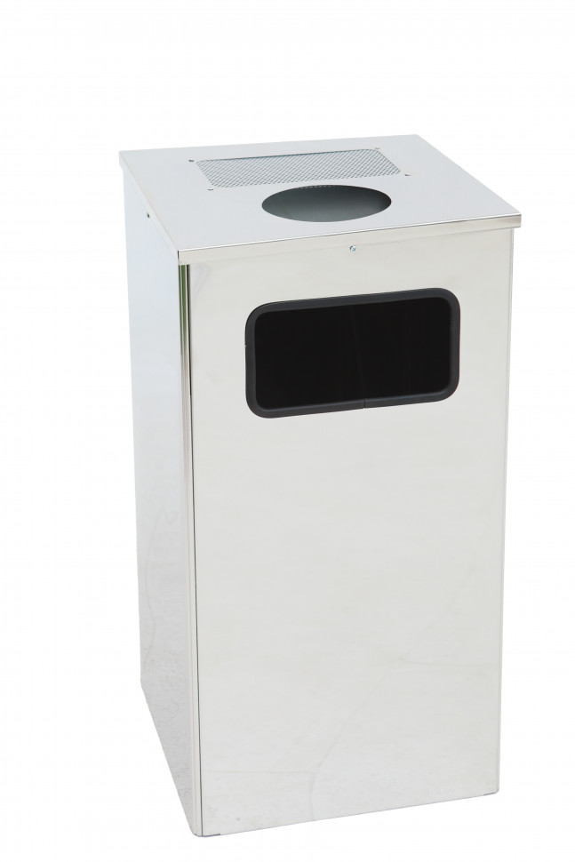 Мобильная разборная урна серии "Уника.Квадро" . Бак выполнен из зеркальной нержавеющей стали. Внутри бака находиться рамка-держатель для пакета. Крышка снабжена емкостью для окурков, а также сетчатым сигаретогасителем.  В комплект входят уголки для анкерного крепления к полу. Объем бака 80 литров.