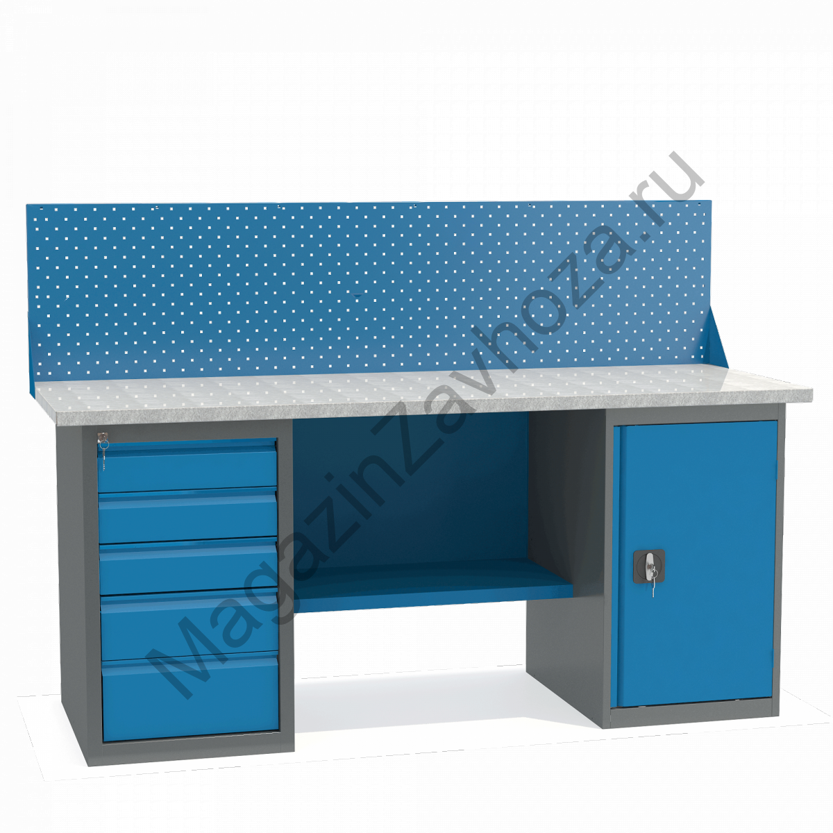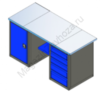 • Верстак укомплектован драйвером с пятью выдвижными ящиками разными по высоте и тумбой с полками.