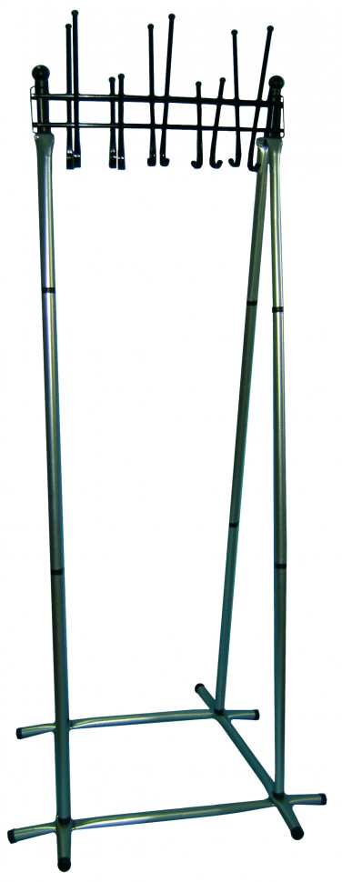 Групповая вешалка на 10 мест. Вешалка выполнена из оцинкованной стали. Крючки вешалки выполнены из трубы диаметром 10 мм. Вешалка поставляется в разобранном виде, в картонной таре. Данная модель вешалки может использоваться как фрагмент для обустройства гардеробных комнат.