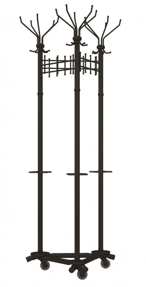Групповые трехсекционные вешалки типа Гардикс 3-Т22 на колесах занимают очень мало места. Они особенно удобны для углового размещения. Удобная и вместительная вешалка позволяет компактно разместить большое количество одежды на трех пятирожковых головах и трех решетках, вертикальные штыри которых предназначены для подвешивания как одежды, так и сумок. Четыре полноценные зонтичницы с чашечками для сбора воды позволяют удобно размещать зонты-трости.