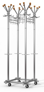 Вешалка гардеробная на колесах. Материал — стальная труба диаметром 38 мм. Поставляется в разобранном виде. 20 мест для размещения одежды и головных уборов. Подставка для зонтов. Нагрузка на верхний крючок для головных уборов — 1 кг. Максимально допустимая нагрузка — 64 кг.