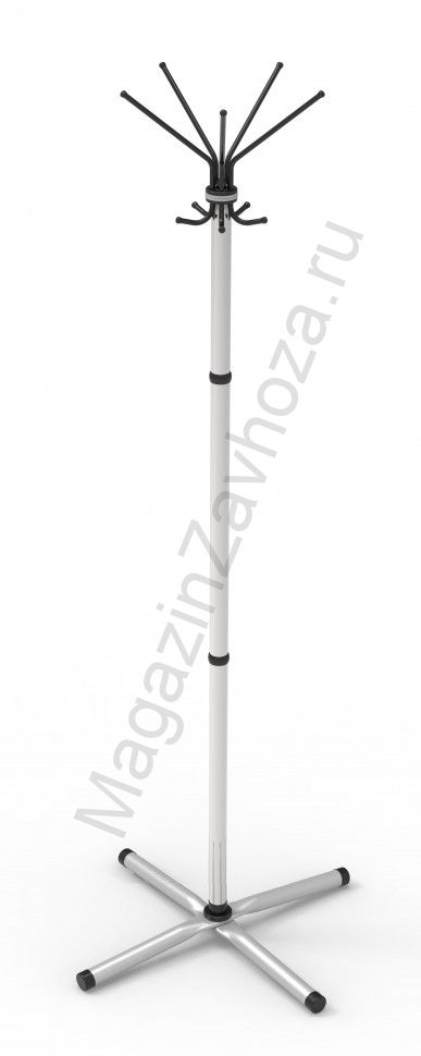 Вешалка напольная на 5 крючков. Выполнена из оцинкованной стали с полимерным покрытием. Поставляется в разобранном виде в картонной таре. Элементы вешалки покрыты защитной полиэтиленовой пленкой. Диаметр трубы 38 мм.