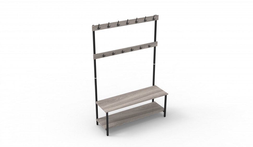 Вешалка "ВГР-6" Каркас: черный глянец.  Варианты цвета ЛДСП: Ясень шимо светлый, Ясень шимо темный. Стойки изготовлены из профильной трубы 25х25, толщина стенки 1,2мм. Покрытие порошково полимерное. Размер изделия: 1150х410х1760+5
