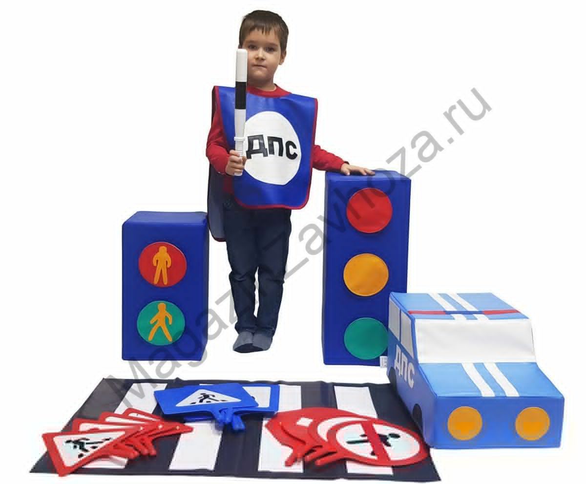 Юный инспектор дорожного движения - это тематический набор мягких модулей, предназначенный для изучения правил дорожного движения в игровой форме. Комплект состоит из следующих элементов:: напольная каталка "Машина дорожно-патрульной службы"; пешеходный переход; мягкий модуль Светофор; мягкий модуль Светофор пешеходный; Жилет сотрудника ДПС; Жезл сотрудника ДПС; Набор знаков дорожного движения в сумке.
